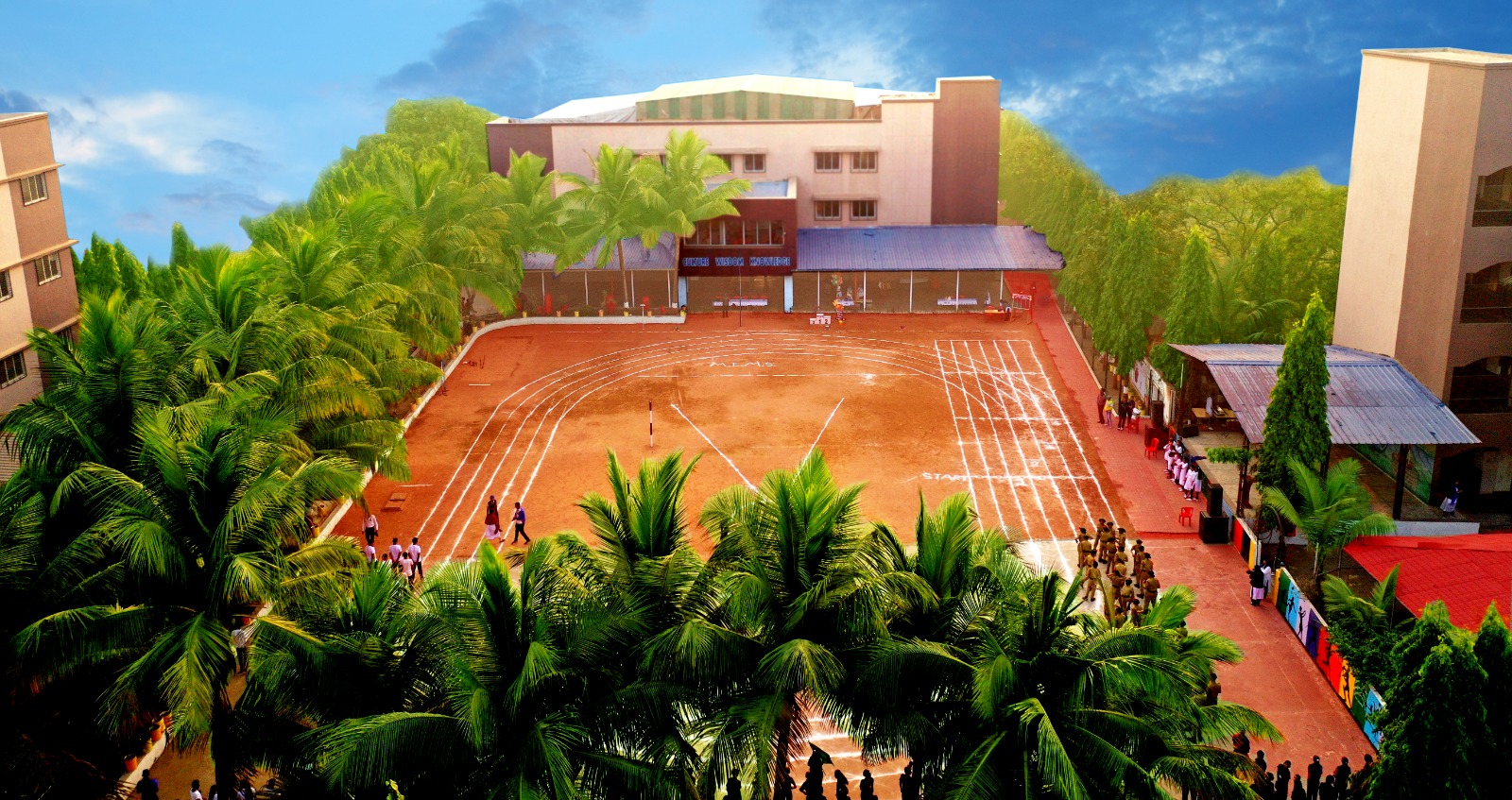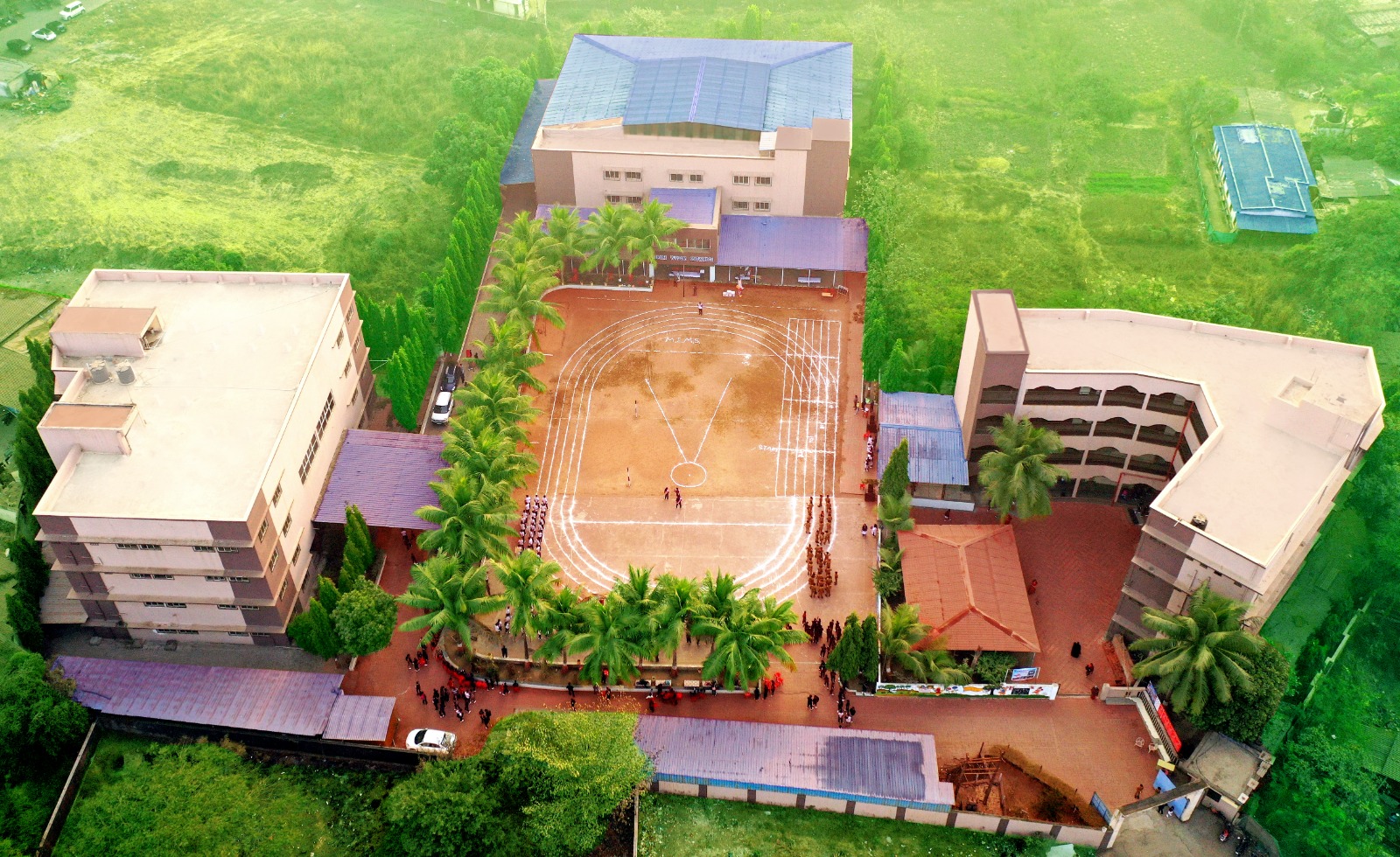 Maorthia English Medium School stands as a beacon of holistic education nestled amidst lush green surroundings. The impressive aerial view showcases a spacious and well-maintained campus with three prominent academic blocks arranged around a central open ground. The ground is marked with a professional athletic track, ideal for various sports and physical training activities, reflecting the school’s emphasis on physical development alongside academics. Lined with tall palm trees, the central courtyard exudes a serene and vibrant atmosphere, often used for morning assemblies, drills, and cultural events. The school buildings are modern, multi-storied, and equipped with wide corridors, offering a conducive environment for learning. The entrance area is secure and welcoming, highlighting the school’s commitment to safety and student well-being. This thoughtfully designed campus fosters academic excellence, sportsmanship, and overall personality development.