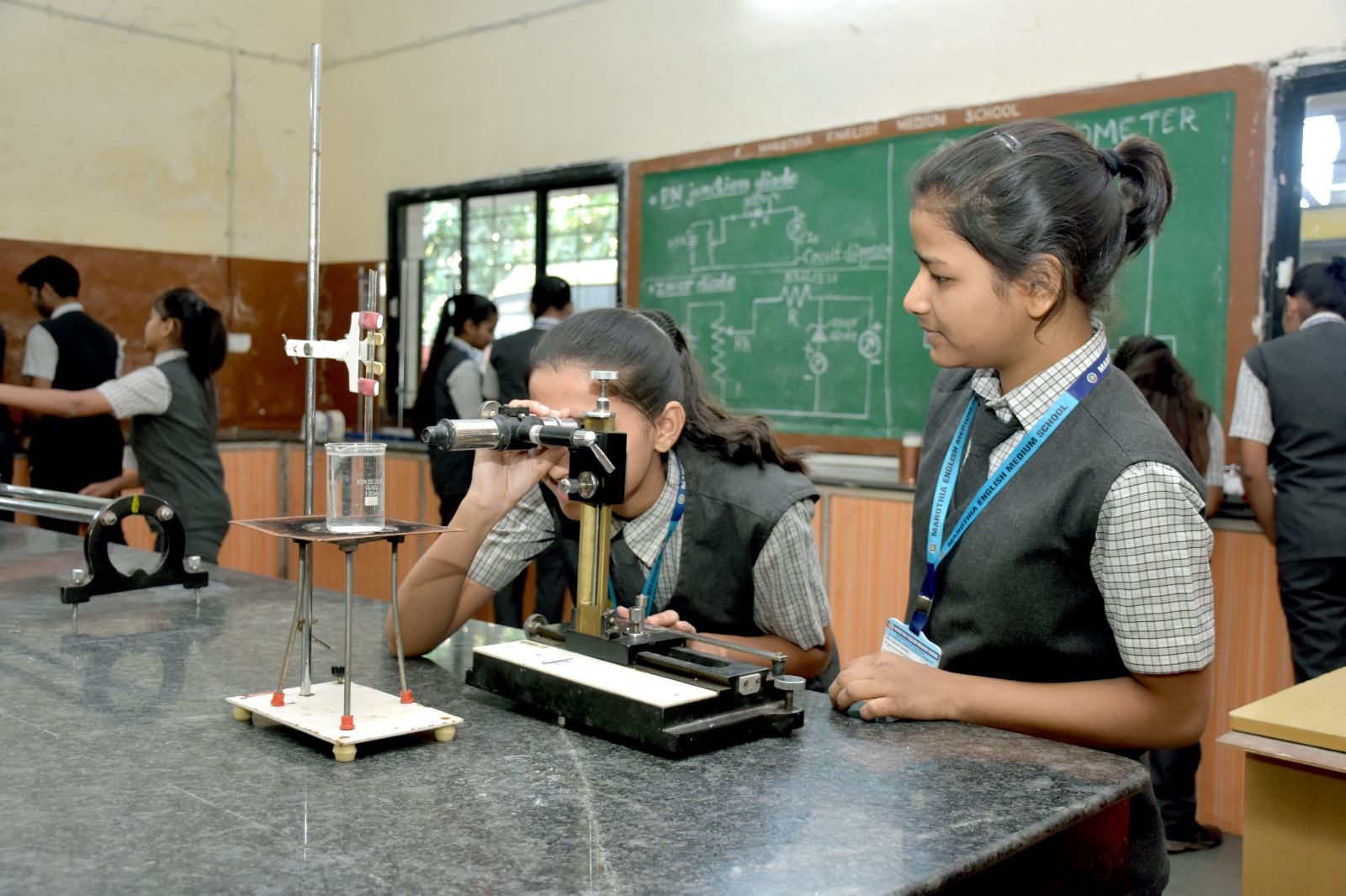 Maorthia English Medium School features a well-furnished Physics Laboratory that nurtures analytical thinking and scientific inquiry among students. As seen in the image, students actively engage in hands-on experiments using precision instruments like the optical bench and voltmeter setups. The lab is spacious, well-lit, and equipped with all essential apparatus to perform experiments related to mechanics, optics, electricity, and magnetism. Detailed circuit diagrams on the blackboard and active student participation reflect the school’s commitment to experiential learning. This practical exposure strengthens theoretical concepts and prepares students for higher studies and scientific pursuits.