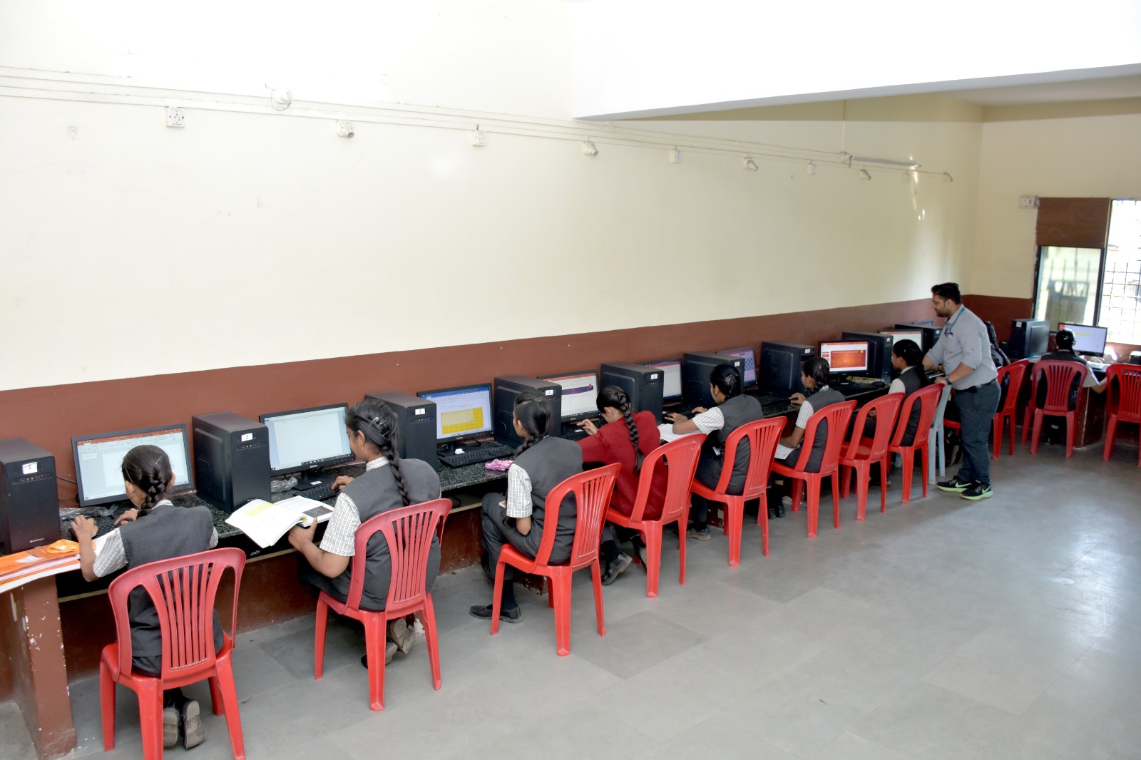 Maorthia English Medium School offers a well-equipped Computer Lab designed to foster digital skills and technological proficiency among students. As depicted in the image, the lab features a row of high-performance desktop computers, each student having individual access to a system. Under the supervision of skilled instructors, students are taught various software applications, coding basics, and internet tools, enabling them to stay ahead in the digital age. The lab maintains a disciplined learning environment with ample space, proper lighting, and essential resources that promote focused and hands-on learning. This facility ensures that students are not just users of technology but creators and innovators of tomorrow.